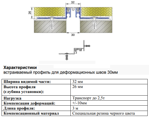 | Тип профиля | Ширина шва (a) | Перемещение | Видимая ширина (b) | Монтажная высота (h) | Нагрузка | Монтажная ширина (s) |