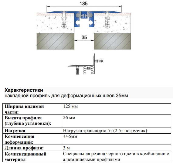 | Тип профілю | Ширина шва (a) | Переміщення | Видима ширина (b) | Монтажна висота (h) | Навантаження |